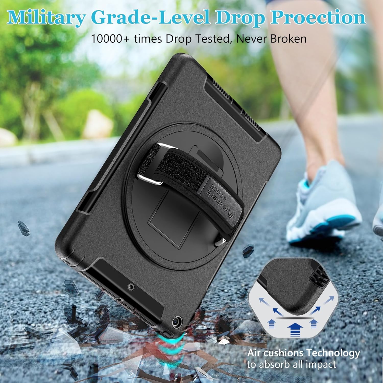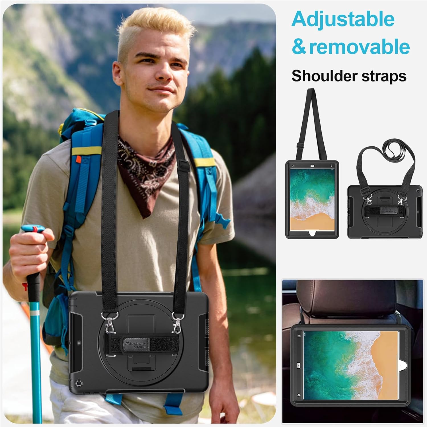 Adjustable Hand Strap + Detachable Shoulder Strap: The hand strap is convenient for holding device. The detachable and adjustable shoulder strap can help you carry your iPad more securely during hiking, traveling other outdoor activities