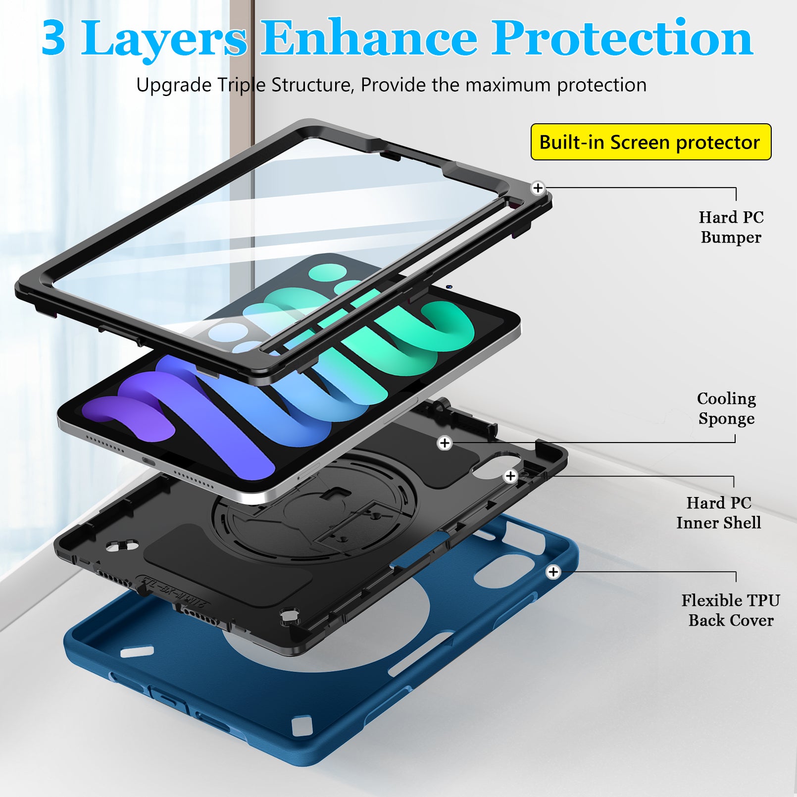 MATERIAL COMPOSITION: This iPad mini 6 case has a built-in screen protector(it can be removed). The inner cover are Made from Hard PC and outer layer Fexible TPU. Our triple defense system has passed the Military Grade Drop Test [MIL-STD 810G-516.6] and can withstand shocks and drops from up to 15 feet, 10,000 times. These shock-absorbent layers incorporate Air Cushion Technology to effectively protect your iPad from accidental drops, bumps, and scratches
