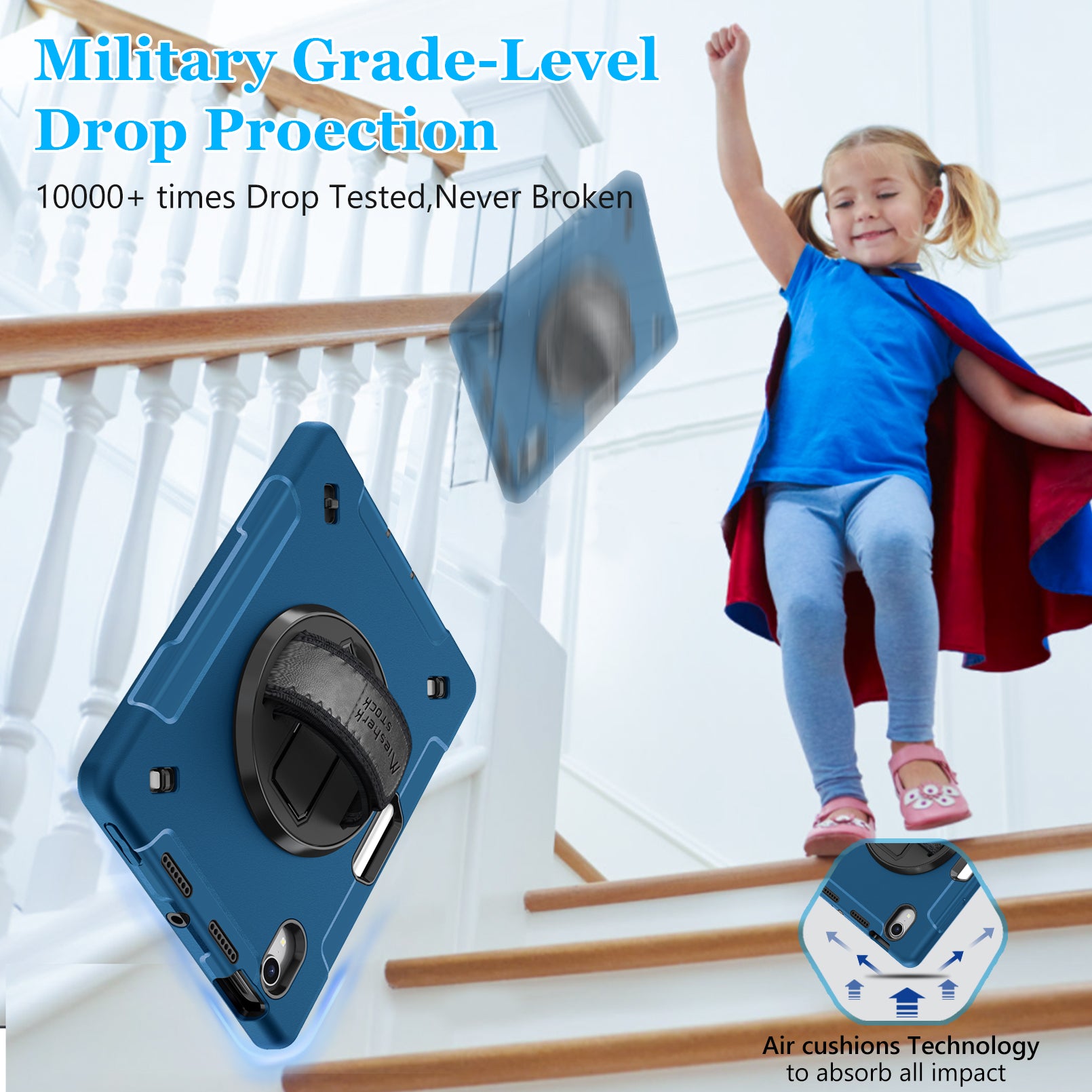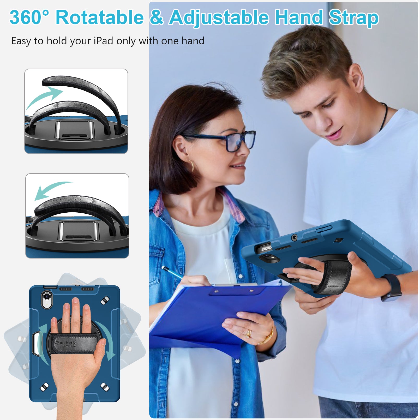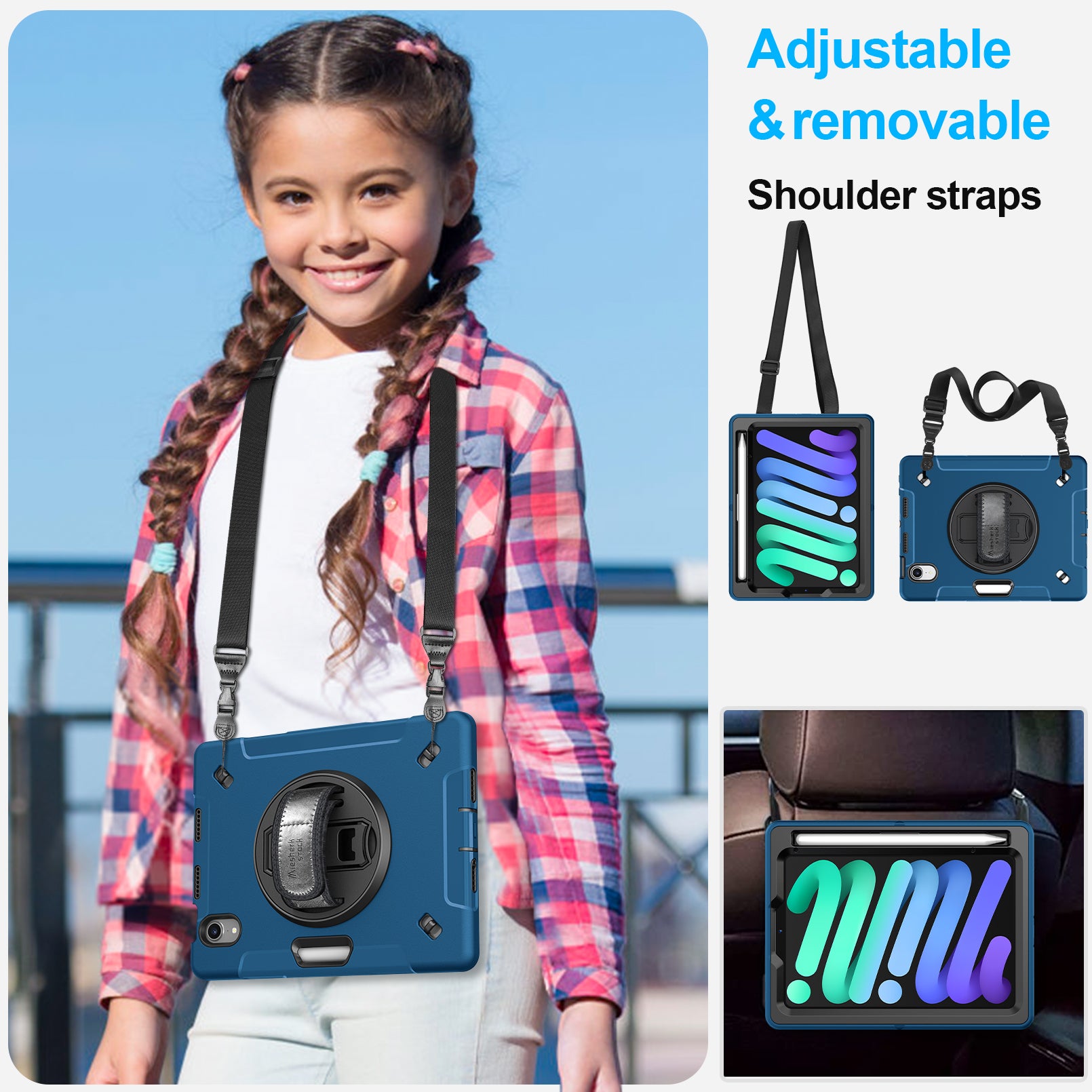 Case for iPad Mini 7 (A17 Pro) 2024: Military Grade TPU Protective Cover for iPad Mini 7th/6th Generation 8.3 Inch with Screen Protector- Stand + Handle + Shoulder Strap + Pencil Holder-Blue