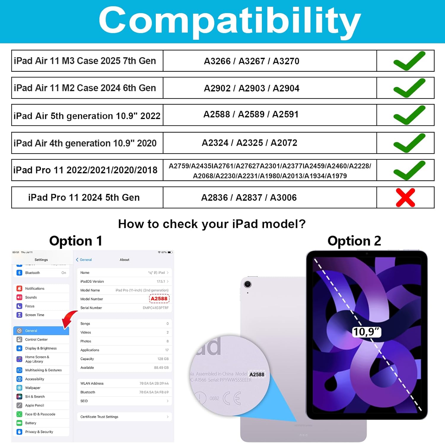 【Compatibility】 Designed for Pad Air 11 Case M3 2025 7th Generation (A3266, A3267, A3270, M2 2024 iPad Air 11-inch (Model: A3266, A3267, A3270; A2902/A2903/A2904), iPad Air 4th Generation 2020, iPad Air 5th Generation 2022 10.9 Inch, iPad Pro 11 inch 2020 2nd Generation & 1st Generation 2018, (model: A2228, A2068, A2230, A2231, A1980, A2013, A1934, A1979, A2072, A2316, A2324 , A2325).