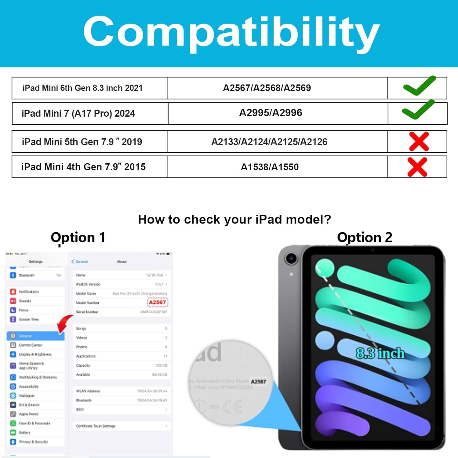 【Compatibility】 Designed for new iPad Mini 7(A17 Pro) 2024 8.3-inch, for iPad Mini 6th Gen 8.3'' 2021(model: A2567/A2568/A2569). Before purchasing, please confirm the model at the bottom of the iPad.