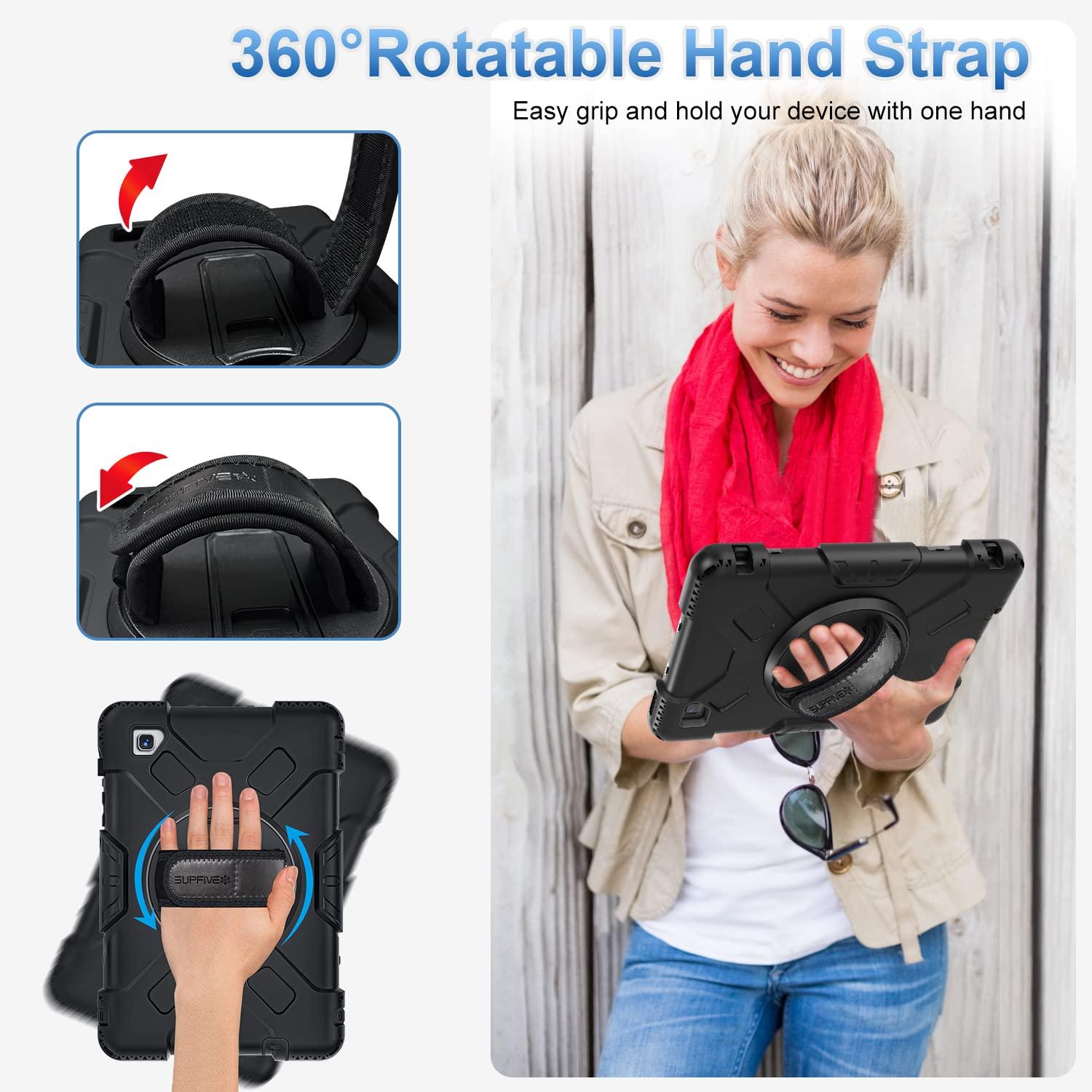 Soft Handle Strap & Portable Shoulder Strap & Rotating Stand : 1. Soft leather fabric hand strap is confortable for holding. 2. Nylon cross-body strap can help carrying with a more secure way during hiking, traveling and car seat. 3. 360 degrees swivel stand suppots different using angles for watching videos, conference, movies and games